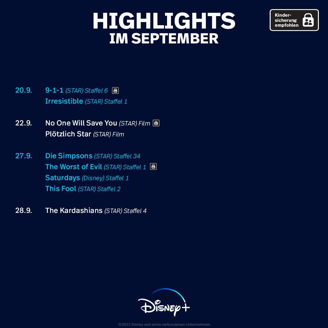 Und das Herbstwetter kann kommen. 🙏 Welche September-Highlights kommen auf deine #DisneyPlus Watchlist?