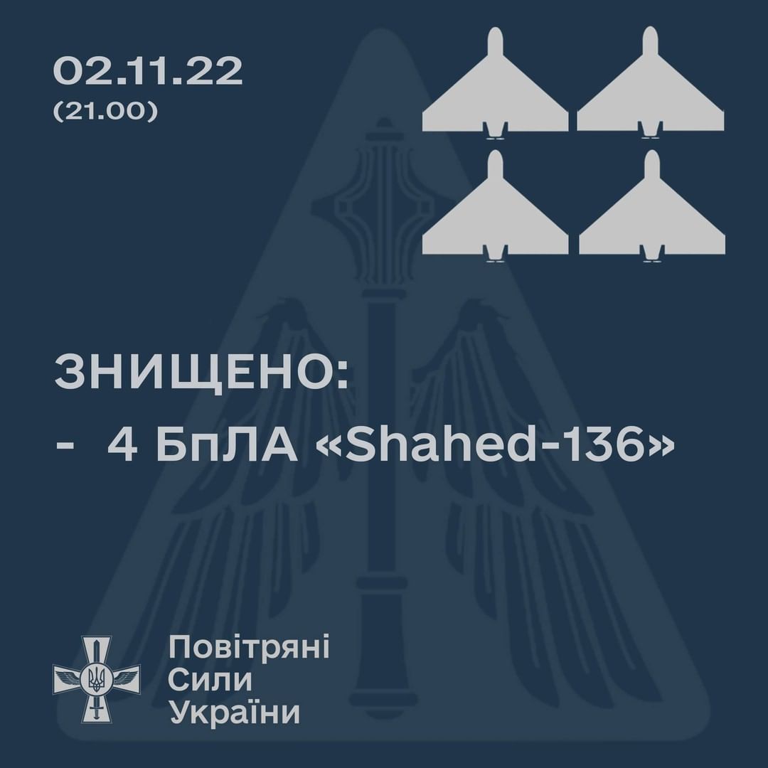 ⚡️ Близько 21 години 2 листопада над Дніпропетровщиною знищено чотири дрони-камікадзе “Shahed-136”