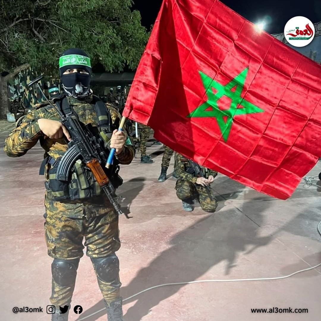 أحد عناصر كتائب القسام بغزة يرفع العلم المغربي احتفالا بتأهل منتخب الأسود لنصف نهائي المونديال