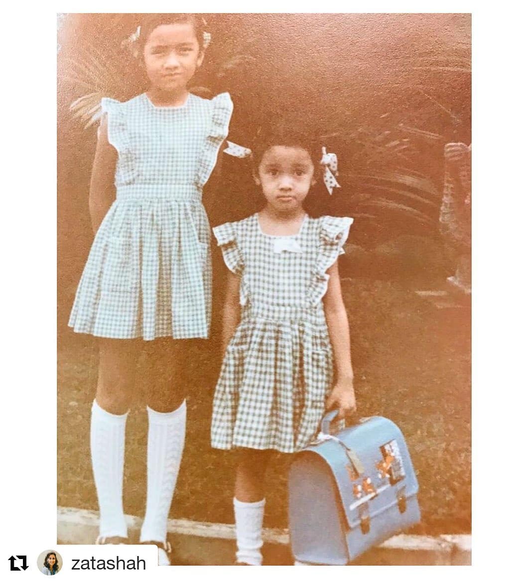 Major #flashbackfriday ~ my mum managed to unearth this classic school photo of my elder sister Zerafina (Fairfield house 💙) and me Zatashah (Fleming house ❤️) at Alice Smith School. FYI my brother was in Scott house. I think my satchel was bigger than me here but i remember it so well, aged 5 or 6 yrs old 🤣🤣🤣 #alicesmithschool