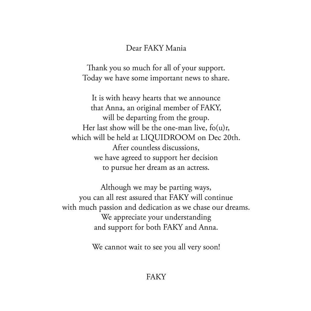 I apologize for the sudden announcement... I’d like to talk about this to you in person at our show on Dec 20th. Thank you for your understanding. 突然のご報告で驚かせてしまってごめんなさい。 ワンマンの日に直接みなさまにお話させてください。 ⠀⠀⠀⠀⠀⠀⠀⠀⠀⠀⠀⠀ Anna