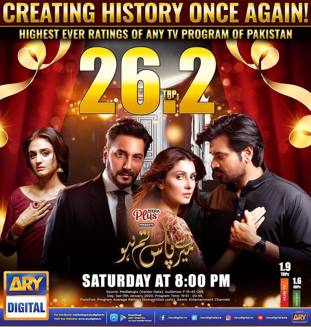 Wow❗️#MerayPaasTumHo creates HISTORY Once Again‼️It has broken its own record, and has the Highest Ever Ratings of Any TV Program of Pakistan. Thank you viewers’ for the phenomenal response on the 2nd Last Episode! Don’t miss the Last Mega Double Episode on 25th Jan, 2020 on #ARYDigital and in cinemas across Pakistan.