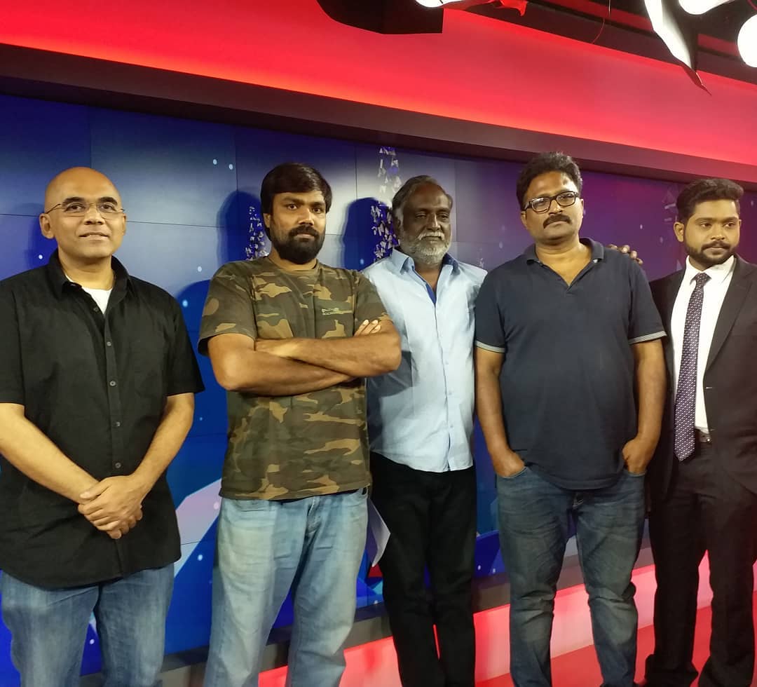 A few months ago, director Balaji Tharaneetharan directed a scene with director Ram, writer Bava Chelladurai and me for Seethakathi. I wasn't sure it would make it to the final cut, but apparently it has. This is a picture from the newsroom set.