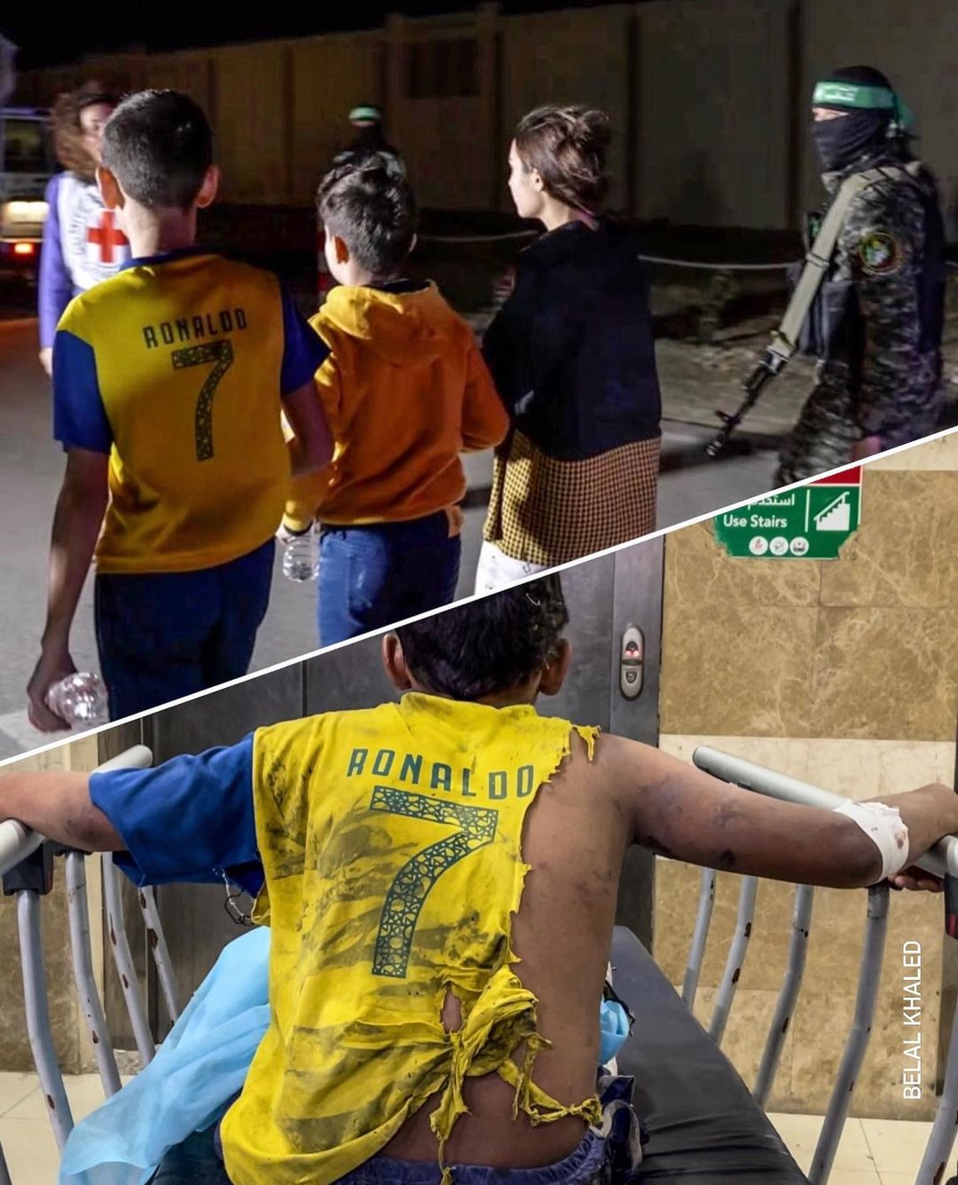 A tale of two boys wearing the same Ronaldo shirt: the difference between humanity and barbarism. Look at how the Palestinian resistance released an Israeli child wearing a neat and clean Ronaldo shirt. And look at the Palestinian child, how Israeli missiles burned his beloved shirt.