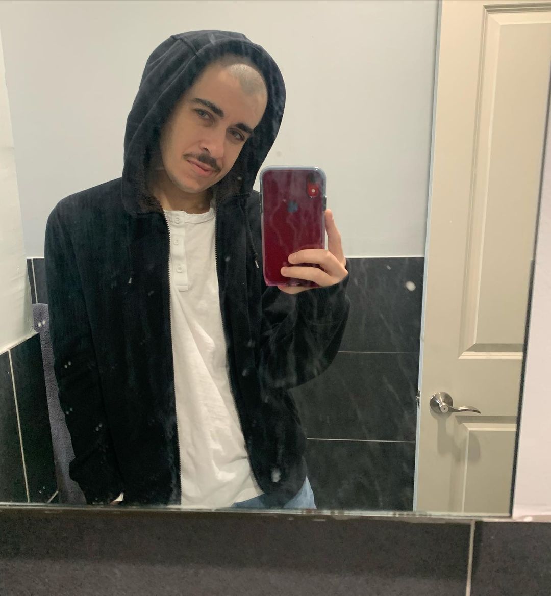ID: (1) selfie of me in my dirty bathroom mirror in a white shirt and black hoodie; (2) photo of me as a kid with a bowl cut and sweater vest next to my childhood dog.