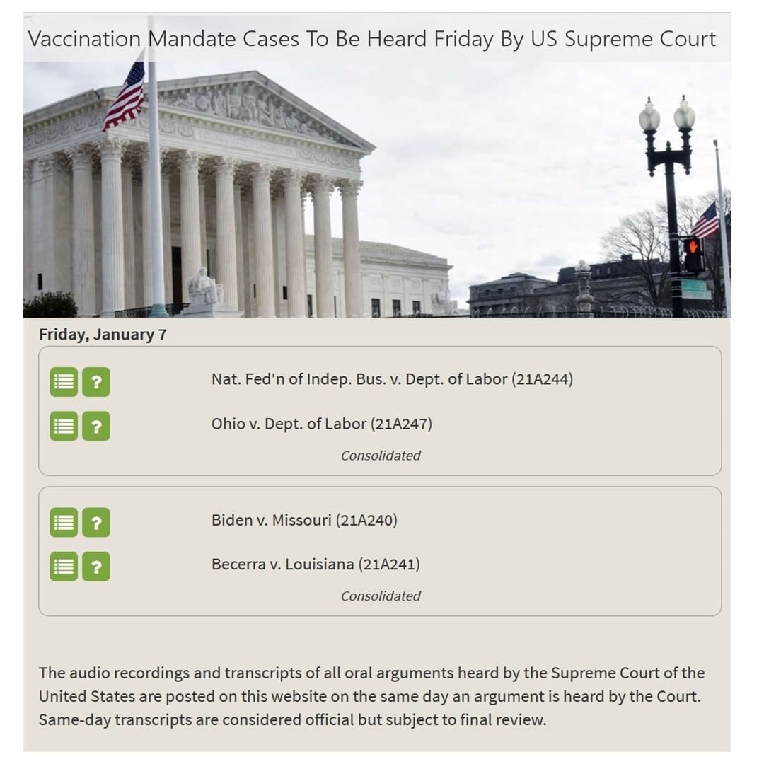 The US Supreme Court will hear oral arguments Friday in two key legal challenges to the Biden administration’s authority on vaccination mandates.