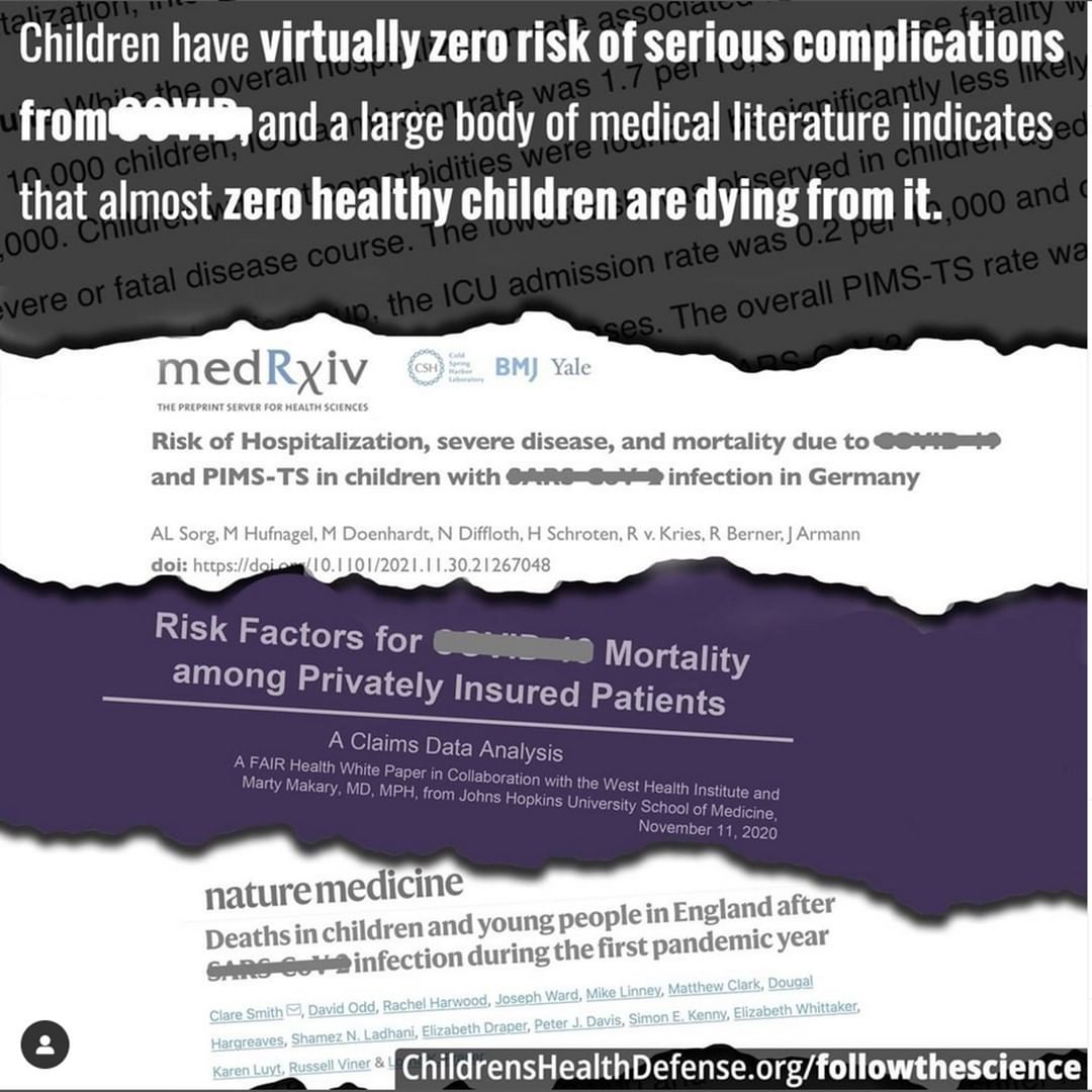 IT’S TIME TO FOLLOW THE SCIENCE! Children have virtually zero risk of serious complications from C - V I D + a large body of medical literature indicates that almost zero healthy children are dying from it. Learn the TRUTH.