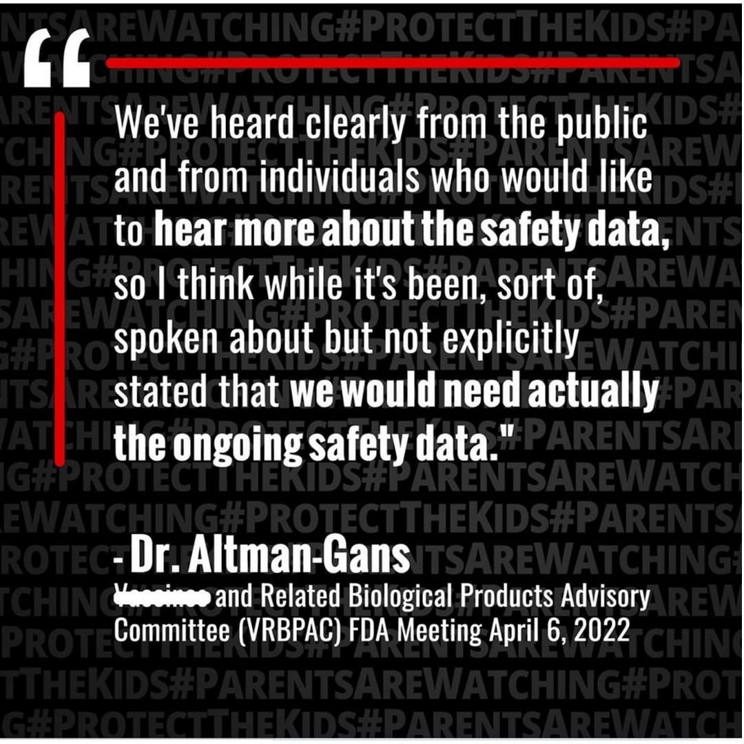 RECAP: During public comments of today’s FDA VRBPAC mtg, 11 people shared their devastating stories of C-0 V I D j @ b injury. Then Dr. Altman-Gans made this stunning admission on the lack of safety data❗️