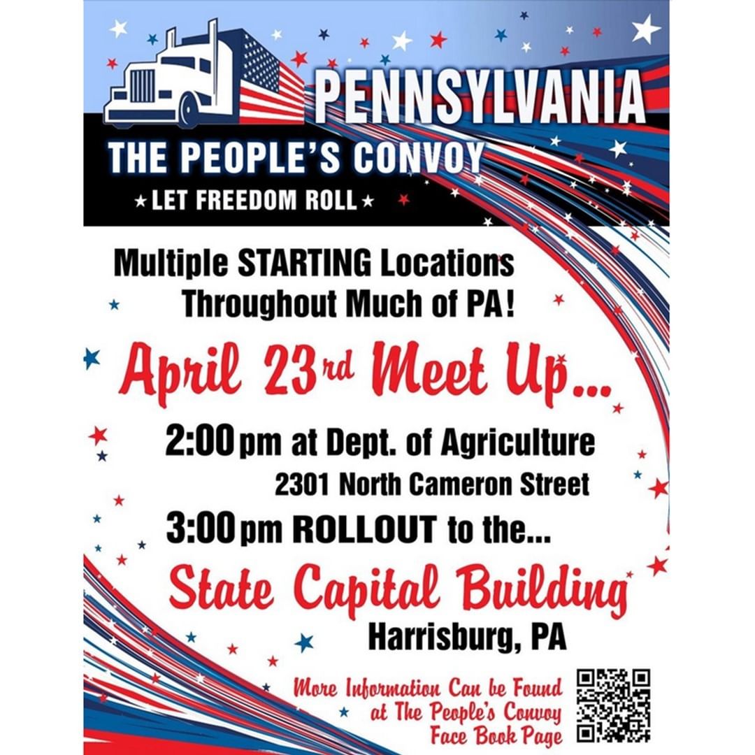 The People's Convoy will be traveling to Harrisburg on April 23rd. All are welcome to attend this patriotic rally and be part of the Convoy traveling to Harrisburg. There will be a meet up at 9:45am at Granite Run Mall, 1067 Baltimore Pike, Media, PA 19063 then travel to Exton Mall Outside Boscov's), 260 Exton Square Parkway, Exton, PA 19341. The Convoy will leave that site at 11am. They are coordinating with other counties in PA that will be joining.