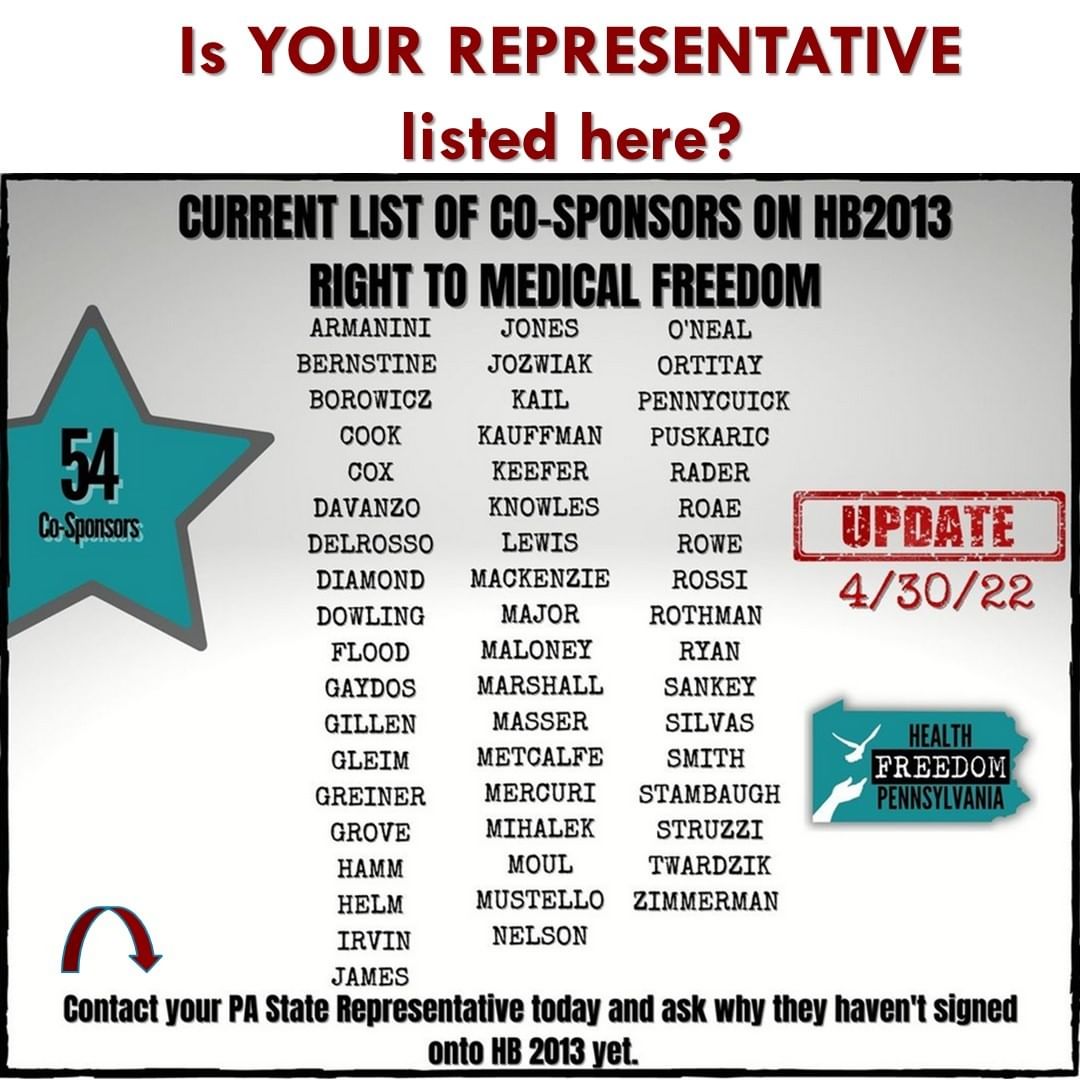 @healthfreedompa We are only 3 Co-sponsors short of our goal of 57 Co-Sponsors before we can put pressure onto the Leadership in our House. Congratulations. đź’ĄThis could not have been done without each and every one of you doing your part and reaching out to your PA Representative.