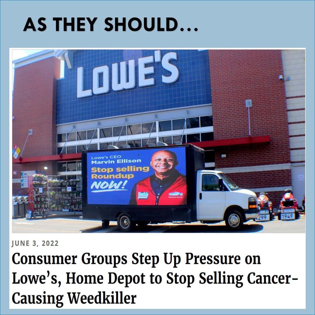 Poisons shouldn't be profitable. A coalition of consumer and environmental groups demanding Lowe’s stop selling glyphosate-based weedkillers installed a giant billboard outside the retailer’s headquarters detailing the dangers of the cancer-causing products to wildlife and humans.