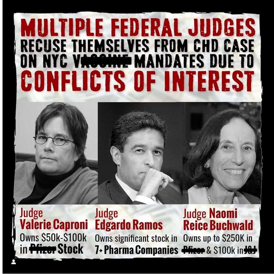 Two fed. judges stepped down from CHD’s lawsuit ag. NY C– v@x mandates due to massive financial conflicts of interest + investments in Big Pharma stock — specifically of C– v@x mfrs. 3rd judge also has conflicts of interest but has REFUSED TO RECUSE.