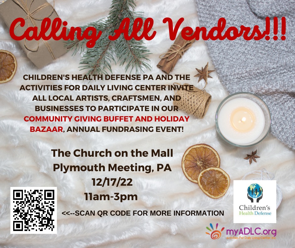 We are very delighted to announce & accept vendor applications for our Community Giving Buffet and Holiday Market on Saturday, December 17th, 11am-3pm. The purpose of the event is to support local small businesses, provide a holiday meal and a venue for the community while supporting two charitable organizations: Children Health Defense of PA and Activities for Daily Living Center.