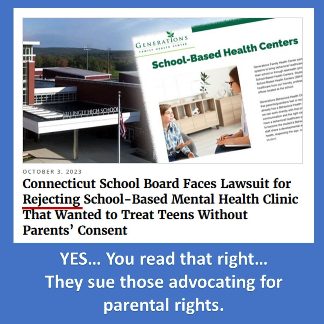 The Killingly, Connecticut, school board faces an inquiry and lawsuit after rejecting a government-funded school-based mental health center run by an outside contractor that doesn’t require parental consent to treat teens.