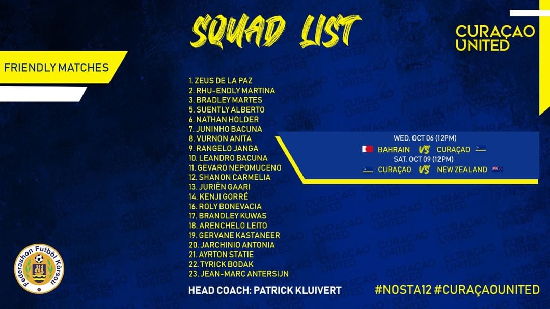 Nos entrenadó interino Sr. Patrick Kluivert huntu ku su staf a saka e lista di 21 hungadó ku lo enfrentá Bahrain, e pais anfitrion, dia 6 di òktober binidero pa despues nos topa New Zealand dia 9 di òktober aya na Bahrain. Ámbos partido lo tuma lugá 12’or di mèrdia, orario di Kòrsou.