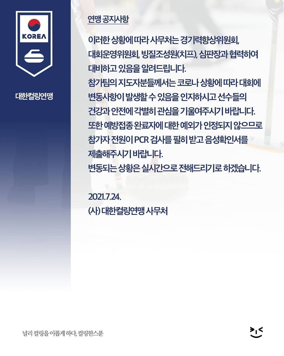 금일 대한컬링연맹은 웹사이트와 SNS를 통하여 믹스더블 국가대표 선발전 관련 공지사항을 게시하였습니다. 이에 전달해 드리오니, 컬링가족분들은 참고하시기 바랍니다. 모쪼록 안전하게 대회가 치뤄졌으면 합니다. 조율하시는 분들 수고가 많으십니다.