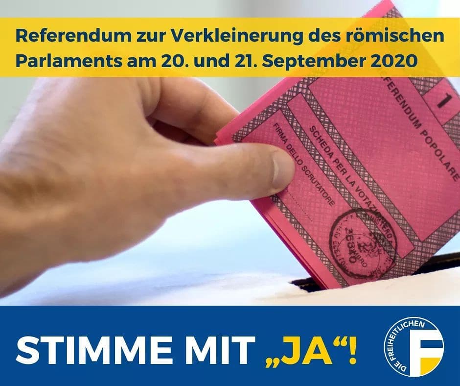 ✅Wir empfehlen beim Verfassungsreferendum zur Verkleinerung des römischen Parlaments am 20. und 21. September mit „Ja“ zu stimmen. . ❗️Damit künftig eine gerechte Repräsentanz nach dem Kräfteverhältnis der Südtiroler Parteien endlich möglich wird, muss in Rom jedoch dringend auf die Schaffung eines eigenen Wahlkreises mit Verhältniswahlrecht gepocht werden.