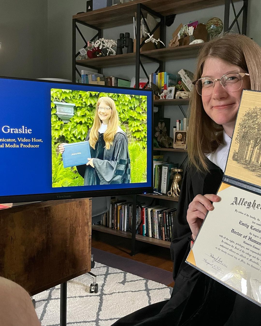 SOOO… Today I accepted the award of an honorary degree, Doctor of Humane Letters, from Allegheny College. 😬🥳 Honestly I was blown away when they contacted me a year ago to offer me this accolade, and I really didn’t know how to feel about it at first. Doctoral degrees are earned through so much hard work, dedication and sacrifice on part of the recipient- it’s difficult for me to equate my work worthy of an honorary degree on the same level. (PLEASE never call me Dr. 😅 it’s not appropriate here!) At the same time it’s an incredible feeling to realize one’s work is noticed, valued and appreciated in a way that is deemed worthy of this distinction. Huge thanks to everyone at @alleghenycollege who has championed my work, and a MAJOR CONGRATULATIONS to everyone graduating this year, having spent your final few semesters during a global pandemic, you are the real rockstars and I AM PROUD OF YOU. 👏🏻👏🏻👏🏻 I wasn’t able to make it in person so swipe to see me BEAMING from my couch in the regalia they sent 😂 GAH.