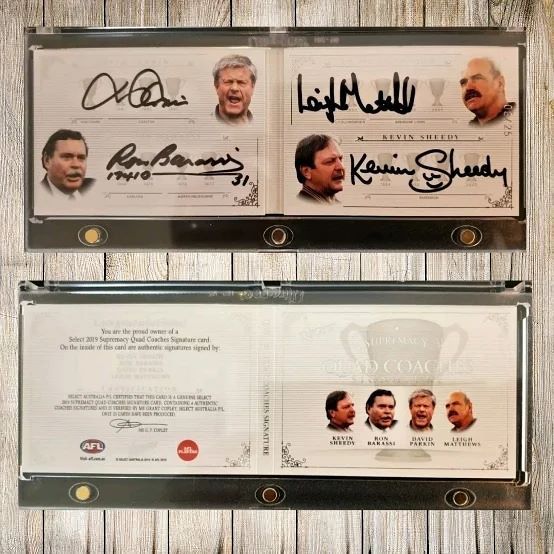 On Sunday (when all the hype was about the new Optimum release) a footy card quietly sold for $9500. One of the 25 copies of the 2019 Select Supremacy Quad Coach Signature card changed ownership, making it the biggest sale of a 21st century footy card...ever!!! (In 2018 an 1890s Bonanza Cigars card of Essendon footballer Will Crebbin sold for an amazing $10,110). The Quad Signature card features 4 of the greatest coaches in Aussie Rules history, Sheeds, Barassi, Parkin and Lethal Leigh, making it potentially the most desirable card in the hobby! @selectfooty #collectselect #footycards #sportscards