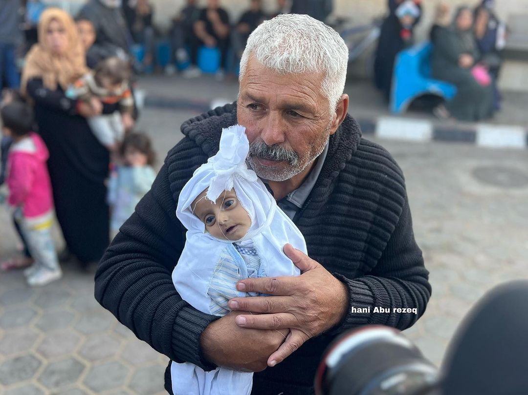 هذا الطفل الرضيع ولد في هذه الحرب واستشه.د فيها، لا يتجاوز عمره الشهر ونصف، استشه.د وهو بين حضن والدته، بعد قصف منزله بمنطقة المغراقة.