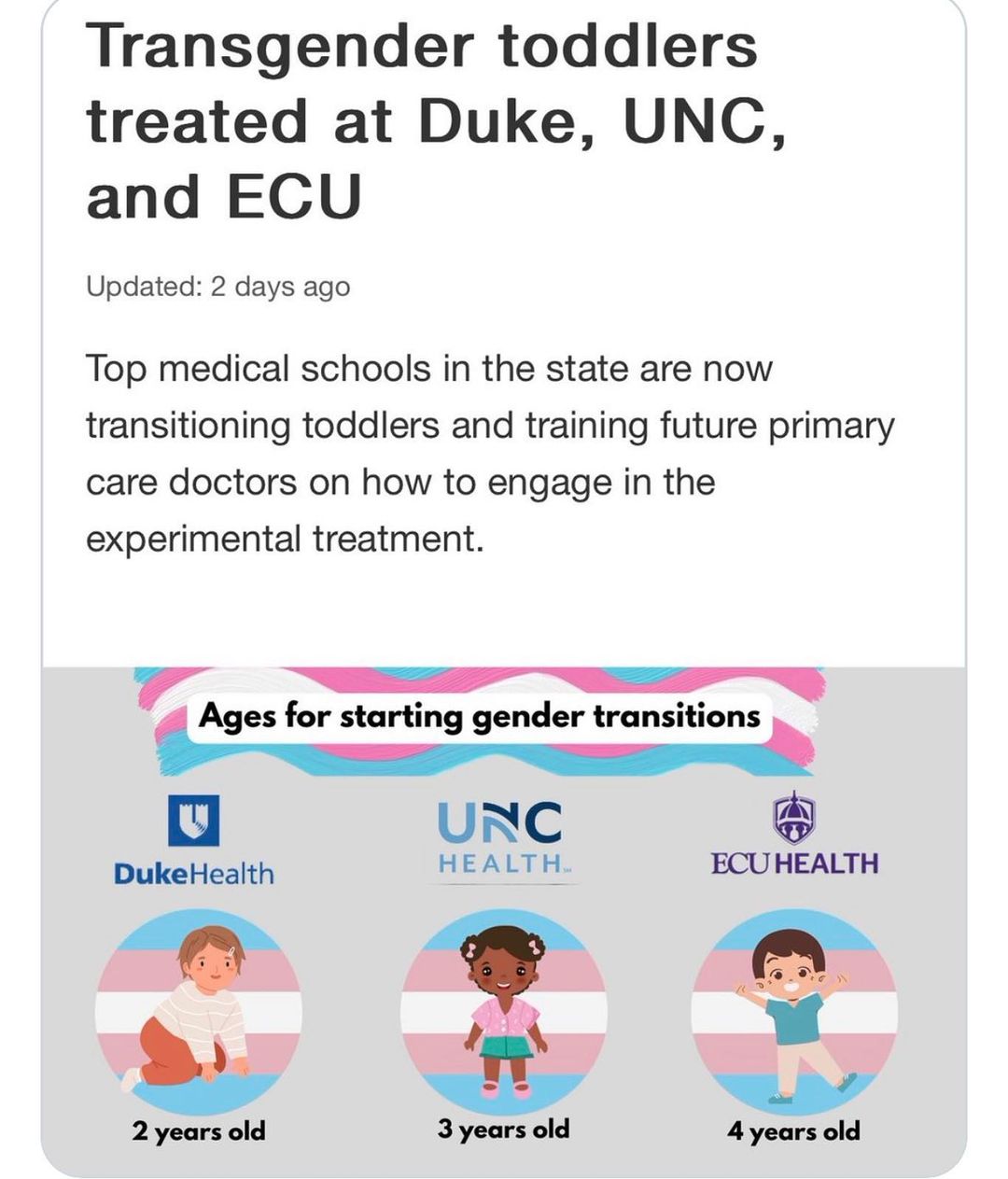 Three medical schools in North Carolina are diagnosing TODDLERS who play with stereotypically opposite gender toys as having GENDER DYSPHORIA and are beginning to transition them!!