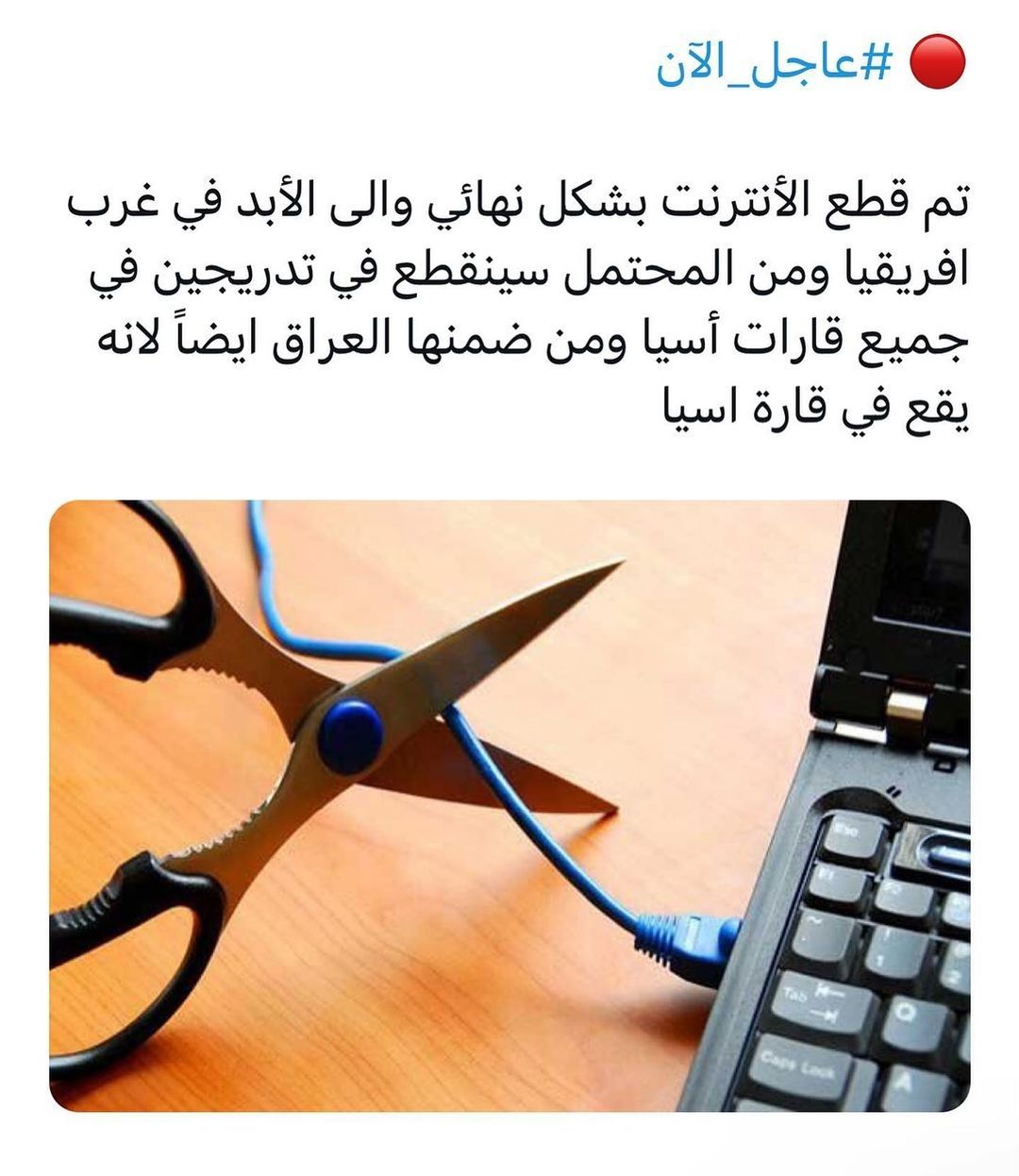 🔴 #عاجل_الآن تم قطع الأنترنت بشكل نهائي والى الأبد في غرب افريقيا ومن المحتمل سينقطع في تدريجين في جميع قارات أسيا ومن ضمنها العراق ايضاً لانه يقع في قارة اسيا