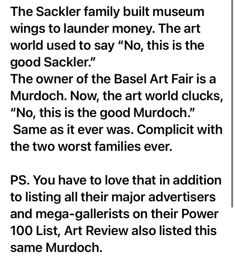 The owner of the Basel Art Fair is a Murdoch. Now, the art world clucks, “No, this is the good Murdoch.” Same as it ever was. Complicit with the two worst families ever.