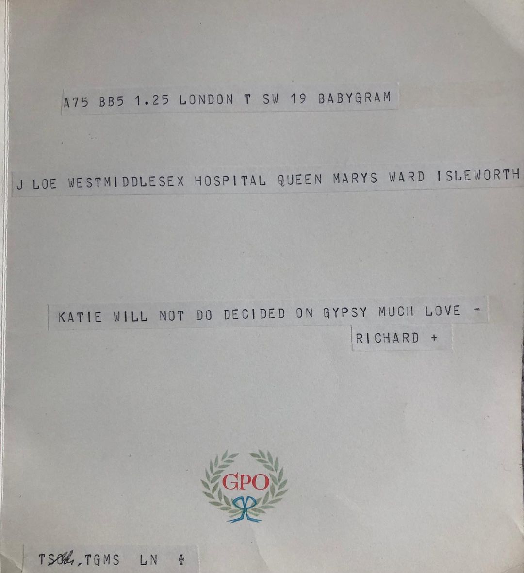 My mum has been organising and found this - telegram from my dad to the hospital when I was born. They’d been trying to decide between two names , picked Kate and then he must have had buyer’s remorse .The compromise in the end was my middle name being Romany… I chose Ruby Tirian Sheen as my daughter’s name the whole pregnancy and then when she was born she looked more like a Lily Mo…. And then a brief panic right before registering when I wanted to call her Ethel. Funny old life #katiewilllnotdo