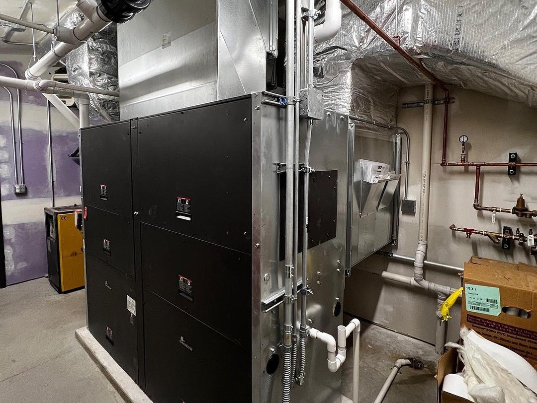 The equipment was just started up on this commercial job in Luverne MN and it all works flawlessly. The main source of heating and cooling comes from 2 geothermal closed loop pressurized systems. There is one 17.5 ton unit that services the shop and one 3 ton unit that services the offices. Both units have inline duct heaters installed to work as a 3rd stage of heat/emergency heat if the compressors or pumps would happen to fail on the geo’s. There is an economizer on the bigger unit to take advantage of free cooling during the cooler spring and fall days. There are two variable frequency drive controllers that run the pumps and a customized controller that executes the order of operations for all of the equipment. The state required a temperature controlled eye wash station due to the harmful products dealt with in the shop. The shop area has two 1725 cfm exhaust fans and an intake louver that work simultaneously to deliver fresh air to the shop. Fun project that turned out great!
