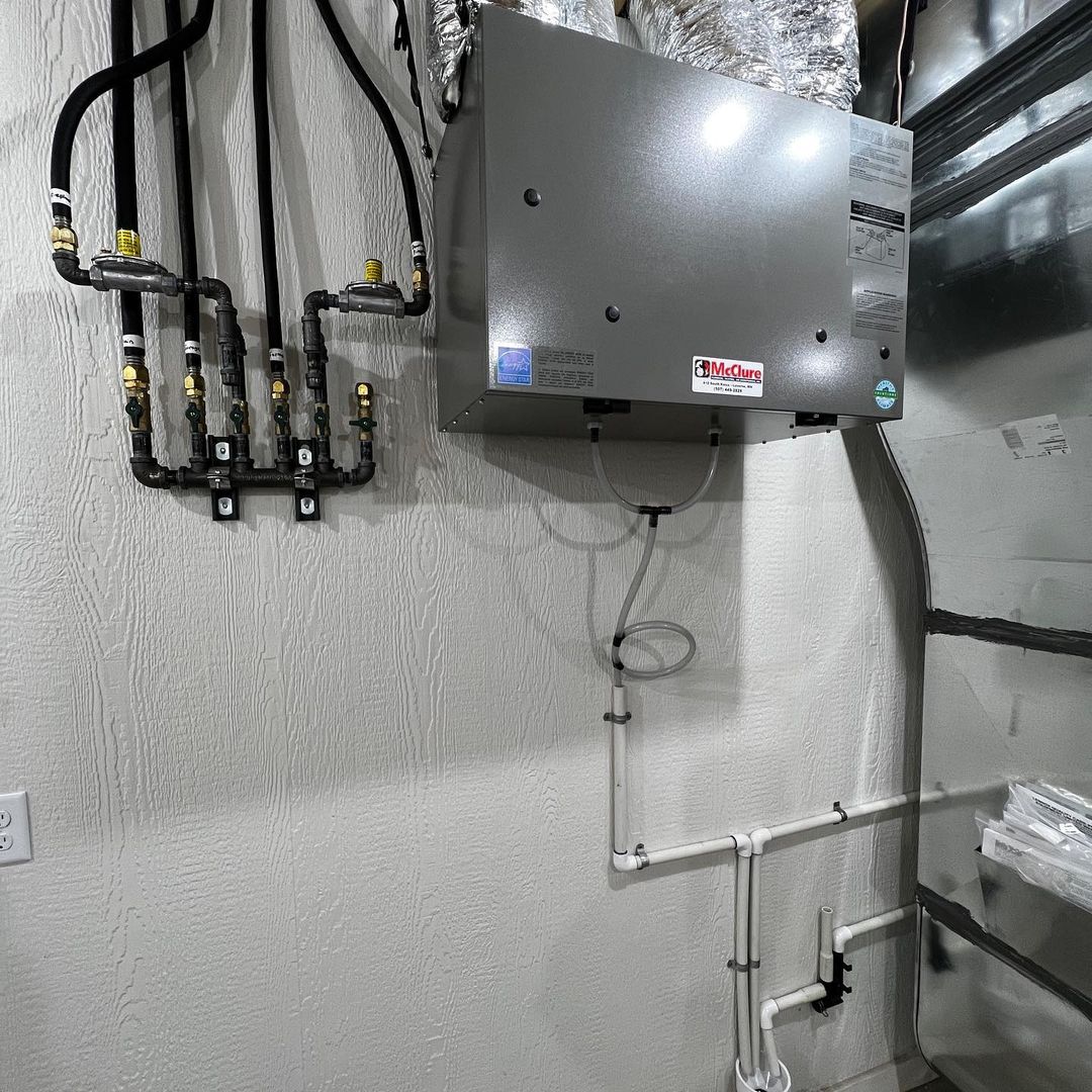 In this new house we installed a 99% efficient 70k BTU Lennox furnace paired with a 16 seer 3 ton Lennox heat pump, a single stage air exchanger, 60k BTU Lennox garage unit heater and a Lennox communicating S30 thermostat that controls and senses everything in the house. A very efficient system that makes for a very comfortable home.