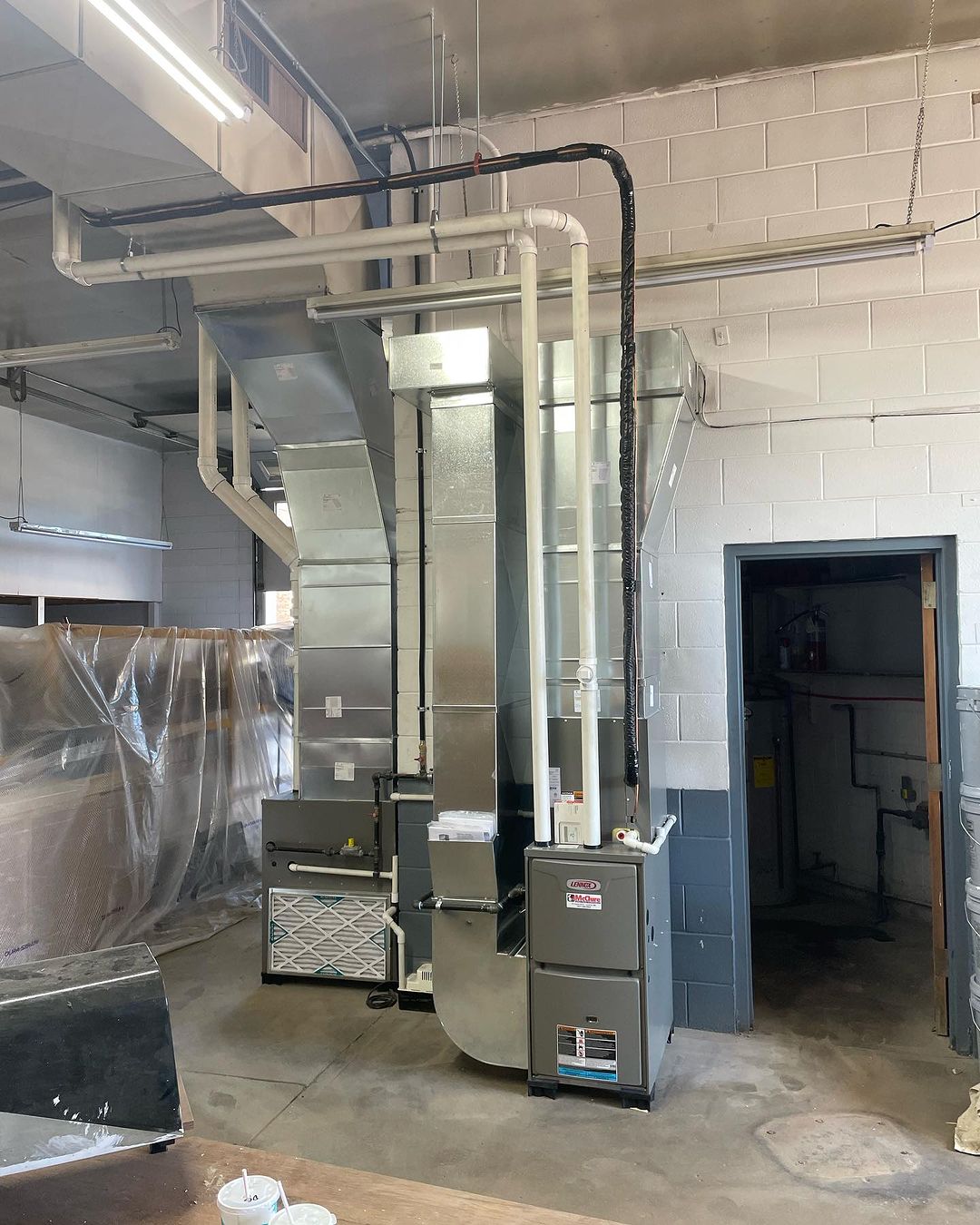 The HVAC crew installed this equipment last week for a new business in Luverne MN. We added air conditioning to the system that will temper the offices/lobby area. Using a ducted system with a furnace in the shop area makes the space much more comfortable and disperses heat evenly compared to a radiant/unit heater. Another quality job complete. Nice job guys!