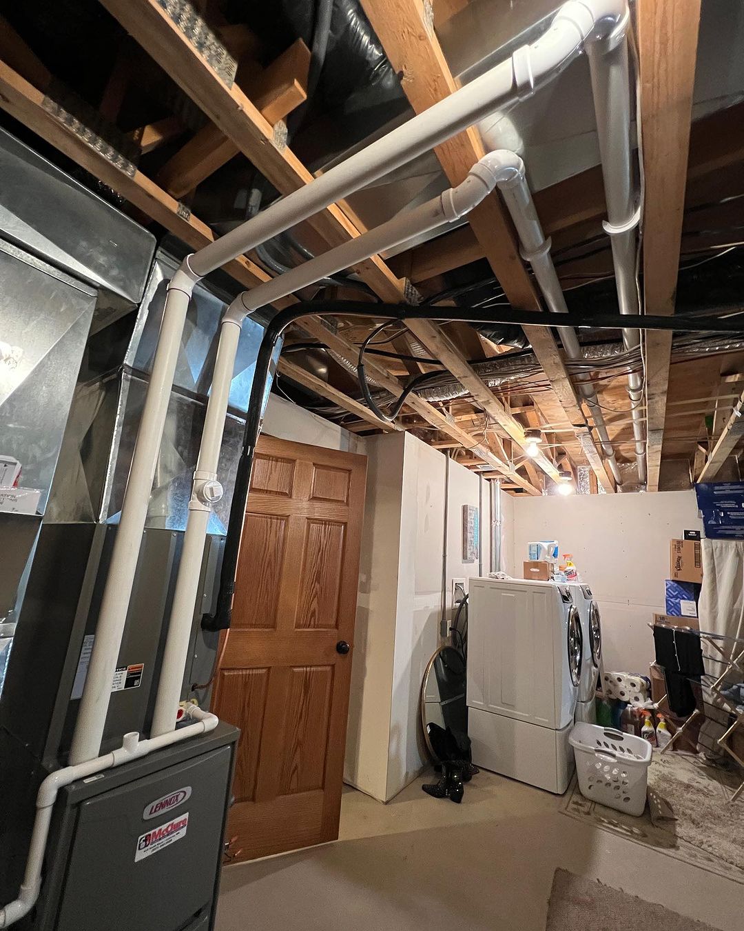 Dyllon, Austin and Quinn replaced a 20+ year old Lennox air handler that had an electric heat bank with this Lennox 96% efficient ML196UH070XE48B furnace and 2 1/2 ton 14 seer condenser coil. We downsized the condenser by a 1/2 ton to increase run time and remove more humidity from the space. Austin built the metal transitions and did a great job! The heating bills should be much cheaper this winter since the customer opted to be changed over to natural gas heat over electric.
