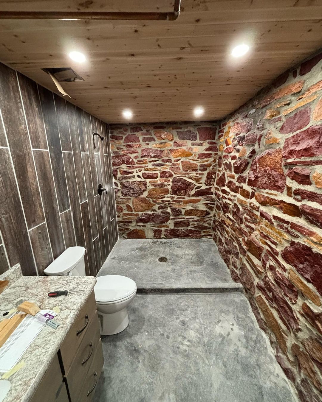 Riley and Craig installed plumbing fixtures in this bathroom remodel in Luverne, MN last week. Awesome looking bathroom with the red rock walls!! #plumbing #fixtures #bathroom #bathroomremodel #redrock