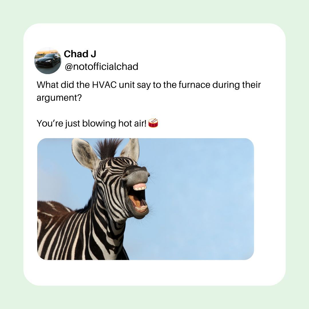 What did the HVAC unit say to the furnace during their argument? You’re just blowing hot air! 🥁 🥁 🥁