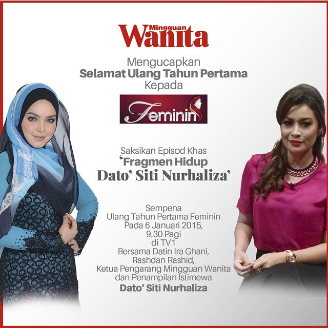 Jgn lupa puan2 utk saksikan rancangan Feminin esok pada pukul 930pagi di TV1, kali ini Mingguan Wanita bersama meraikan ulangtahun rancangan Feminin yg Pertama dlm episod khas 'Fragmen Hidup Siti Nurhaliza'... @feminin_tv1