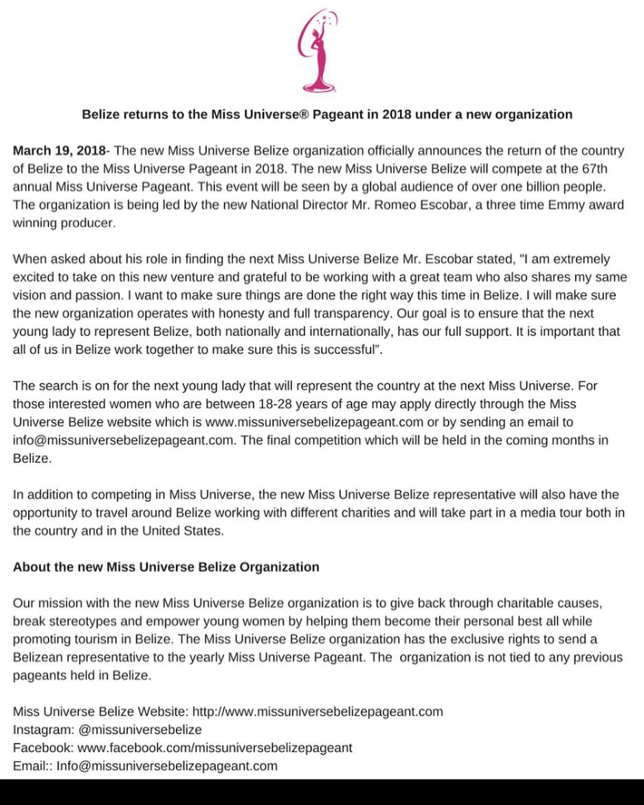 The official press release from the new Miss Universe Belize Organization #missuniverse #missuniverse2018 #missuniversebelize #belize #missbelize #misses #pageant #confidentiallybeautiful #share #contestant #beauty