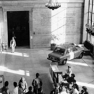 #tbt A car appears in Lobby 10 as part of the Massachusetts Toolpike. #aroundMIT #hacks #tool #punt