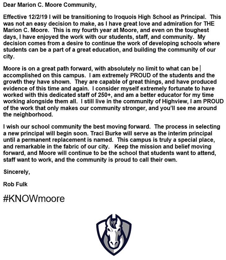 Dear Marion C. Moore Community, Effective 12/2/19 I will be transitioning to Iroquois High School as Principal. This was not an easy decision to make, as I have great love and admiration for THE Marion C. Moore. This is my fourth year at Moore, and even on the toughest days, I have enjoyed the work with our students, staff, and community. My decision comes from a desire to continue the work of developing schools where students can be a part of a great education, and building the community of our city. Moore is on a great path forward, with absolutely no limit to what can be accomplished on this campus. I am extremely PROUD of the students and the growth they have shown. They are capable of great things, and have produced evidence of this time and again. I consider myself extremely fortunate to have worked with this dedicated staff of 250+, and am a better educator for my time working alongside them all. I still live in the community of Highview, I am PROUD of the work that only makes our community stronger, and you’ll see me around the neighborhood. I wish our school community the best moving forward. The process in selecting a new principal will begin soon. Traci Burke will serve as the interim principal until a permanent replacement is named. This campus is truly a special place, and remarkable in the fabric of our city. Keep the mission and belief moving forward, and Moore will continue to be the school that students want to attend, staff want to work, and the community is proud to call their own. Sincerely, Rob Fulk #knowmoore