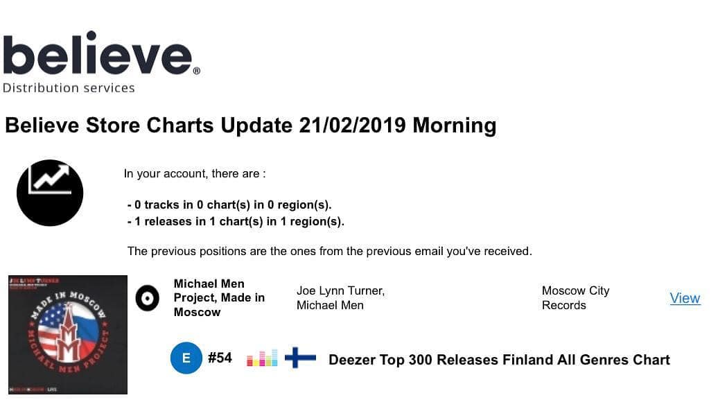 Альбом Joe Lynn Turner, Michael Men - 2005 Michael Men Project. Made In Moscow Live попал в чарт в Финляндии #54 in Deezer Top 300 Releases!