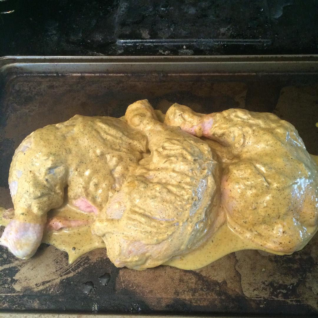 Lets see how this goes, chicken marinaded in coconut milk, turmeric, cumin, garlic, black pepper, curry spice and oregano