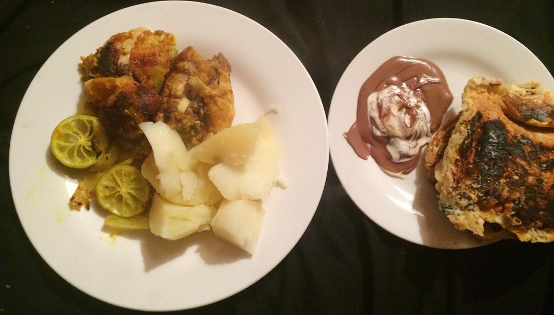 Lime southern fried chicken, boiled sugar potatoes. Burnt Banana pancakes with chocolate cream #homemade #cooking
