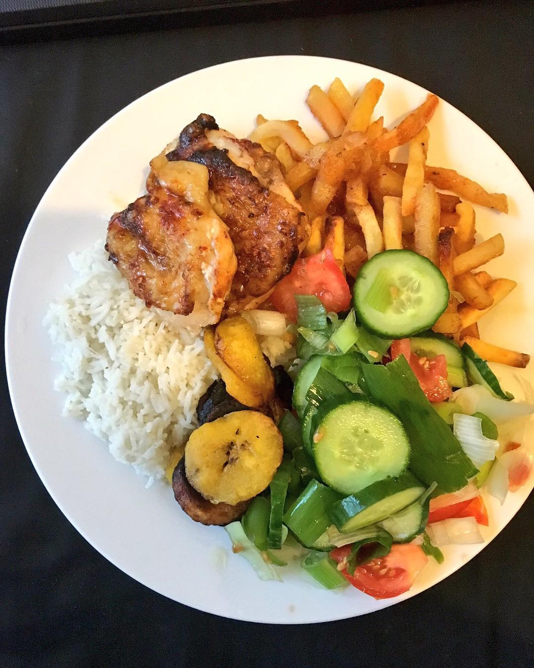 Coconut rice, golden syrup'd peri peri chicken, chips, a spring onion salad, fried plantain #homemadefood #cooking #WifeInTraining #TradLife
