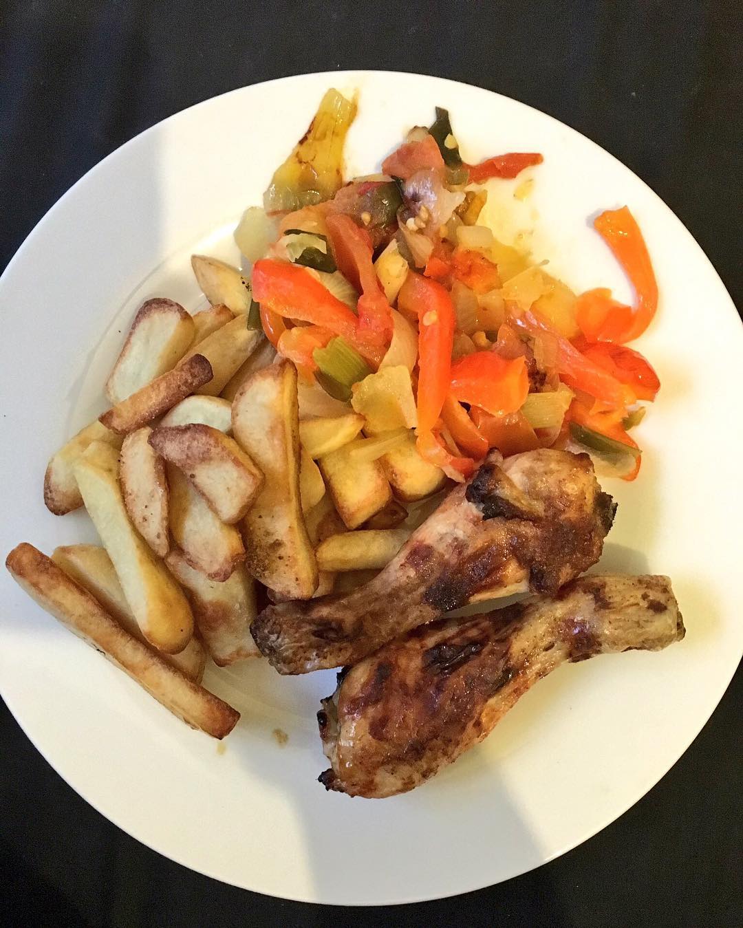 Here's to #TradLife chips, ginger and syrup chicken and a fried onion and pepper salad #cooking #homemade #WifeInTraining