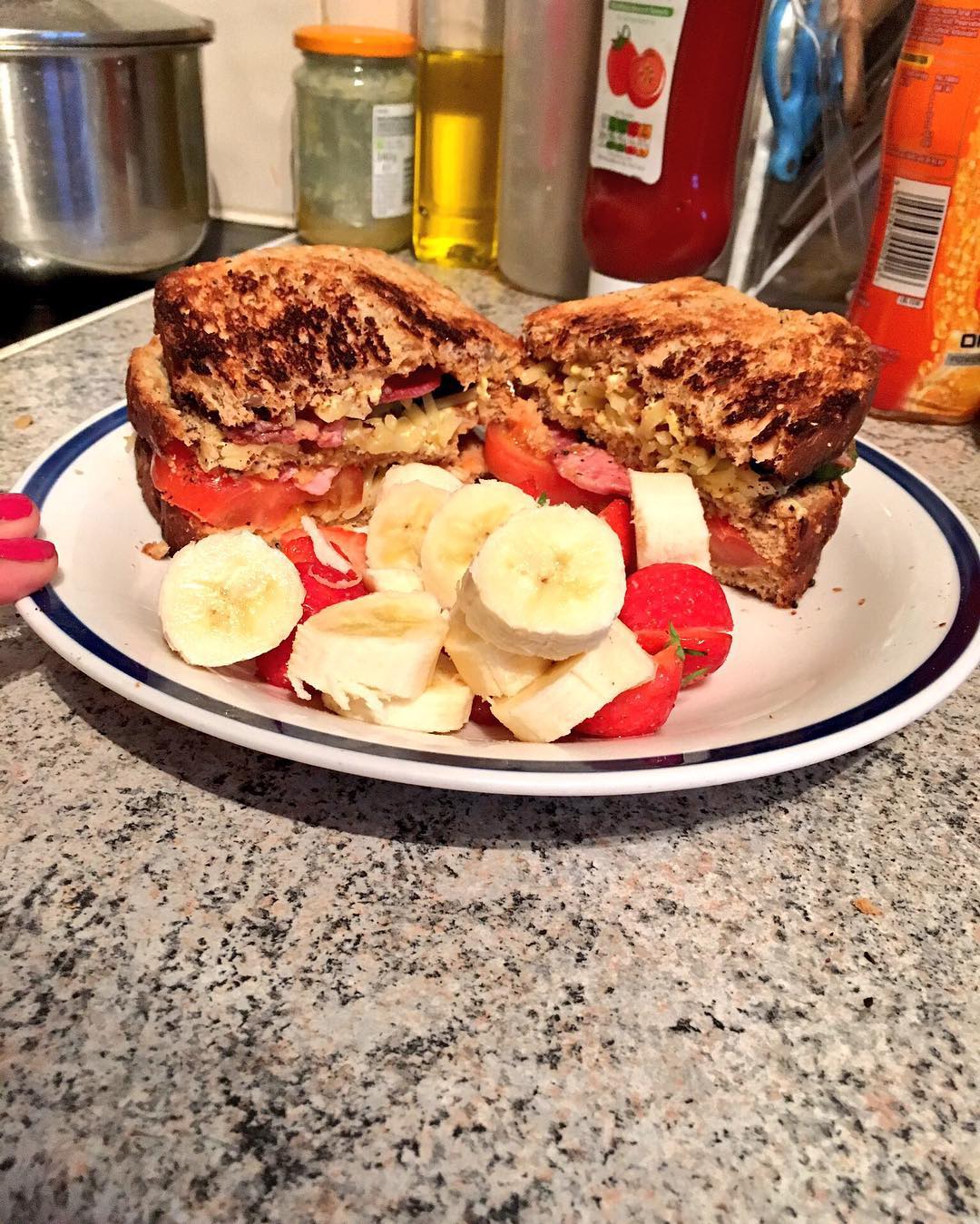 Late lunch after a driving lesson; a two storey bacon, cucumber, tomato, cheese, toasted sandwich and a banana and strawberry side #HomeMade #Cooking
