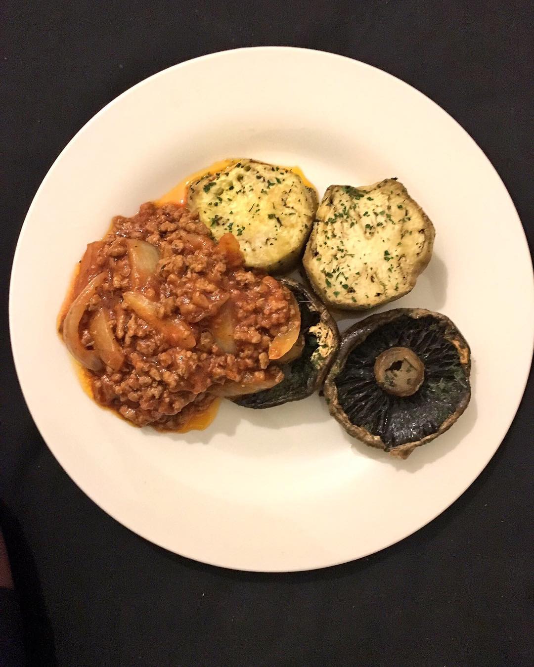 Wild mushroom and aubergine seasoned with parsley and garlic with a tomato and mince side #homemadefood #cooking