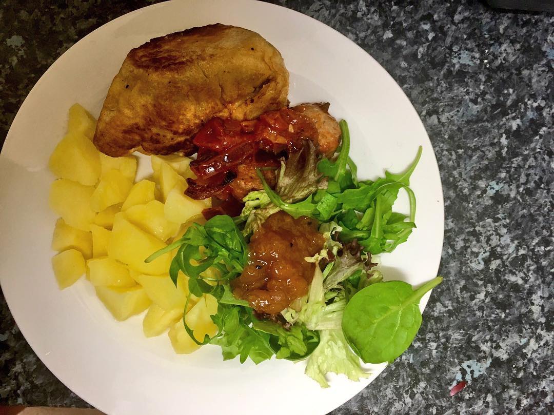 A #homemade fried meatball pie, meatballs, potato chunks and salad with mango chutney #cooking