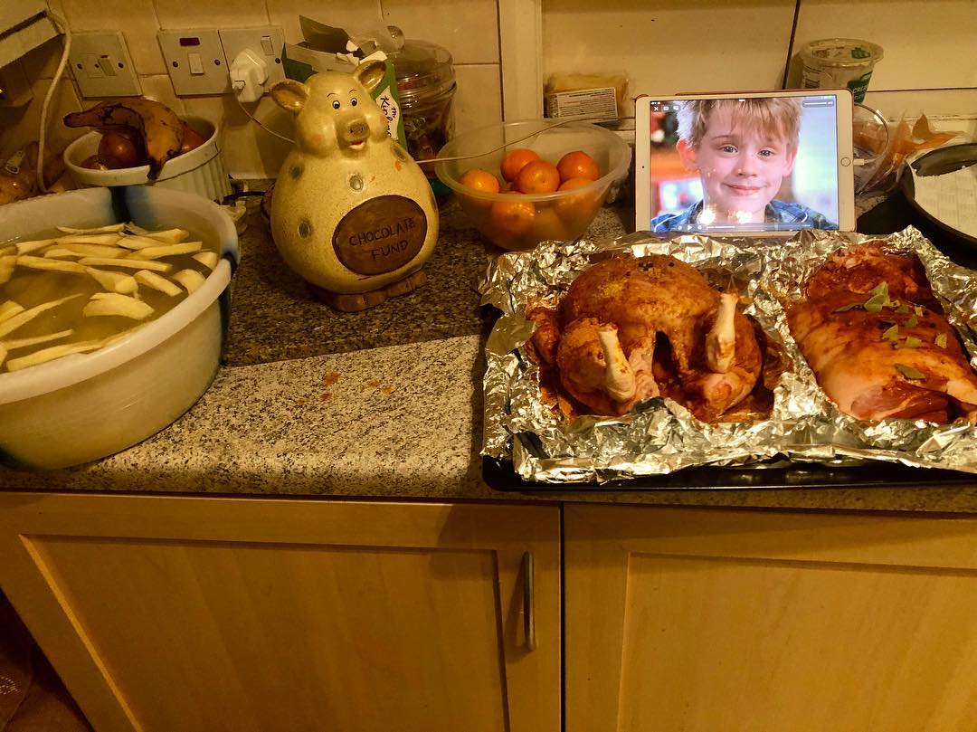 Peeled potatoes 🥔 and peeled and sliced parsnips. Seasoned chicken 🍗 and spiced pork 🐷. #HomeAlone on in the background. The #ChristmasDinner is prepped for tomorrow #BlessThisMess