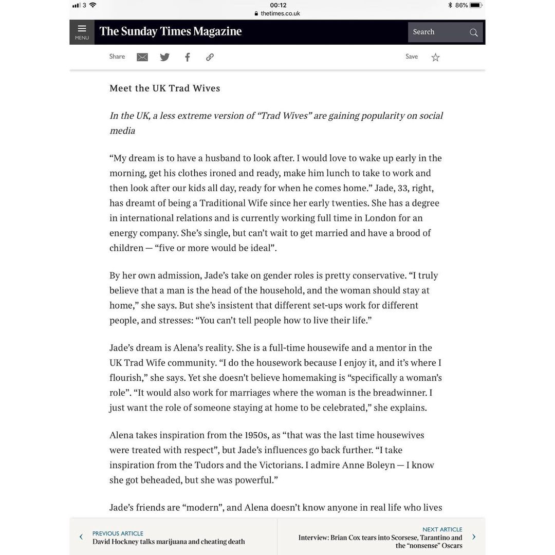 My spread in the #TheSundayTimesMagazine came out today regarding being an aspiring #TradWife, I was so careful with my words so I’m mostly happy with how it came out. Some misquotes but nothing I’m upset about really. #TradFem #TradLife. @thestmagazine