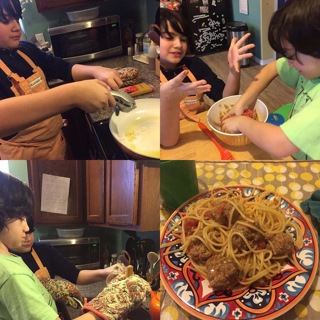 Thursday nights the boys make dinner - spaghetti with homemade meatballs and sauce!