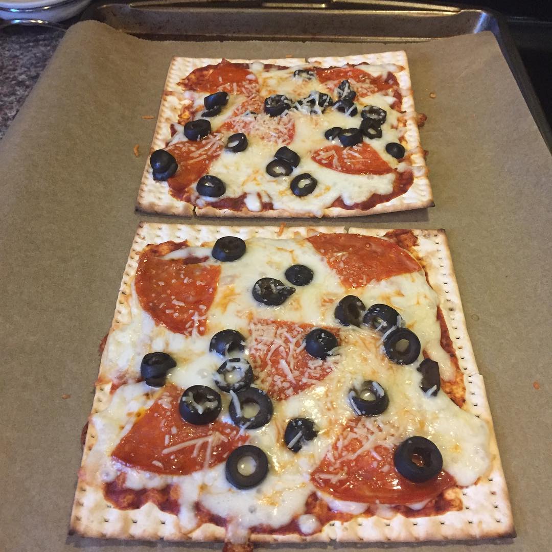Matzo pizza (yeah, that's veggie pepperoni 😉) #pesach2017 #funwiththebreadofaffliction